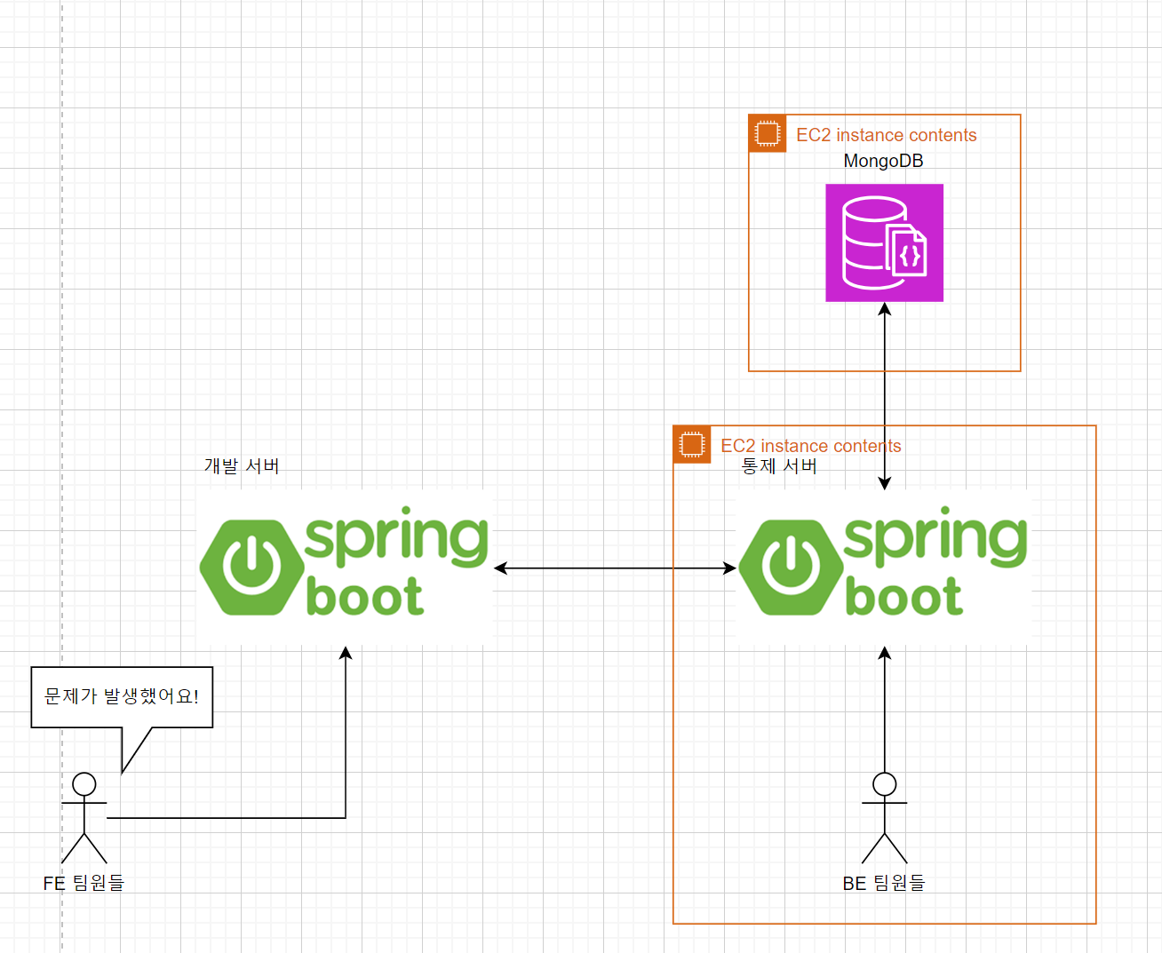 크게 보면 활용한 스택은 다섯가지에 해당합니다. 기본적인 SpringBoot와 Spring Data MongoDB를 활용하여 로그에 대한 통신과 저장을 담당하였고, 통신에 대한 세부 사항은 웹 소켓을 활용하여 통신하는 방식으로 진행해 해당 소켓에 접속해있는 sendTextMessage를 하지 않는 클라이언트의 전부에게 똑같은 로그 데이터를 보내 이를 화면단에 뿌려주는 작업을 하였습니다. 아래는 이러한 과정에 대한 가벼운 아키텍쳐 그림 입니다.